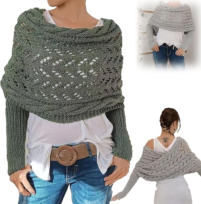 Multifunctional Scarf with Sleeves for Women,Knitted Hollow Out Long Sleeves Shawls,Cross V Collar Knitted Wrap