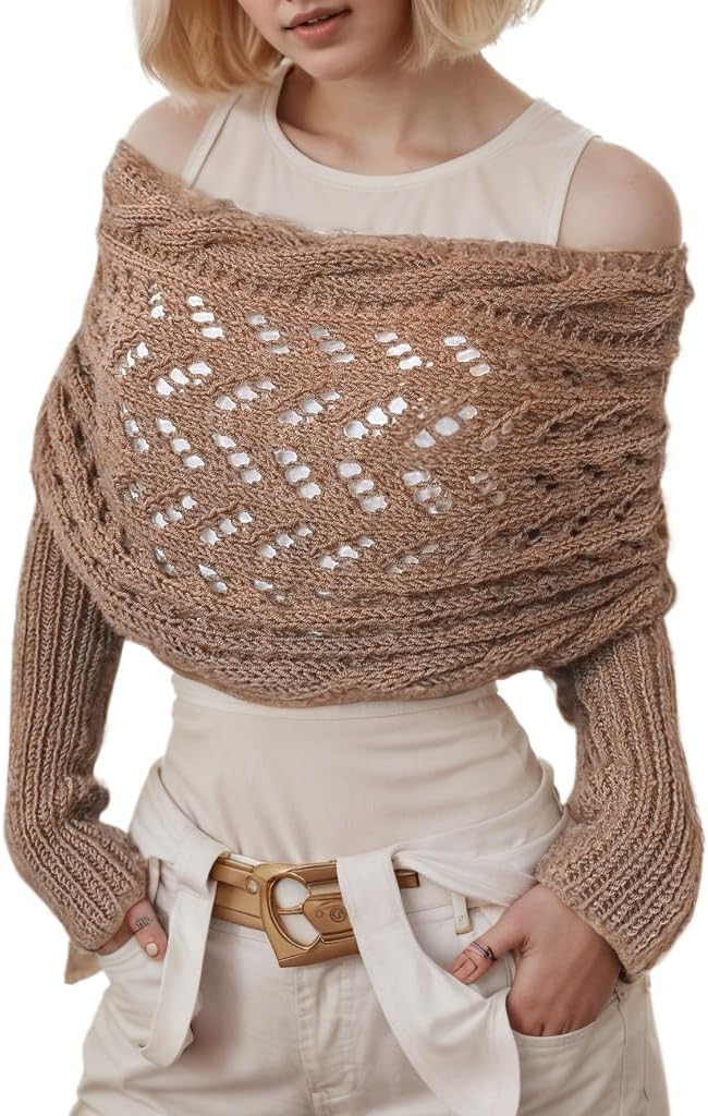 Multifunctional Scarf with Sleeves for Women,Knitted Hollow Out Long Sleeves Shawls,Cross V Collar Knitted Wrap